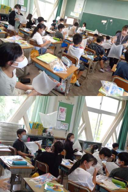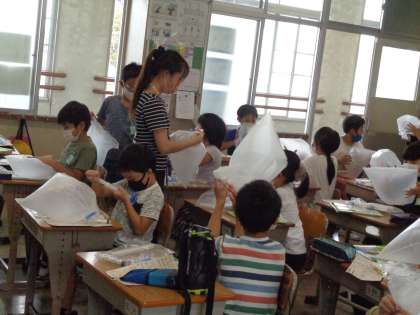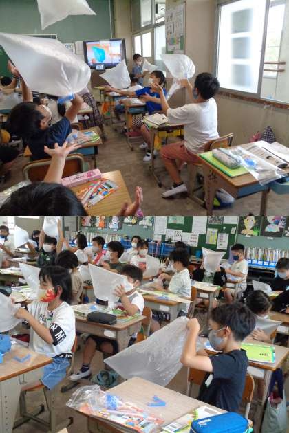 9月24日(金)4年生(3) 公開日 2021/09/24 更新日 2021/09/24 4年 理科では「空気と水」の学習です。今日はまず,目に見えない存在である空気を袋に入れて閉じ込めその存在を体感的に捉えました。写真は2組の様子です。