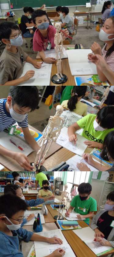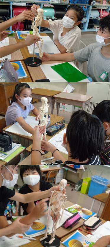3組の理科の授業です。ヒトの体にはかたくてじょうぶな骨とやわらかい筋肉があることを学んでいます。