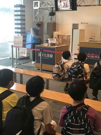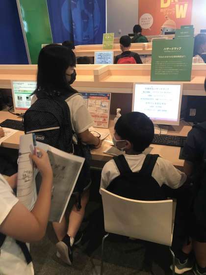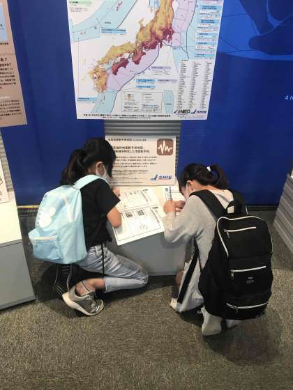 「人と防災未来センター」での活動です。子どもたちは災害学習ノートの問題を調べています。スタッフの方による地震の実験もありました。