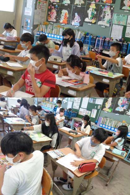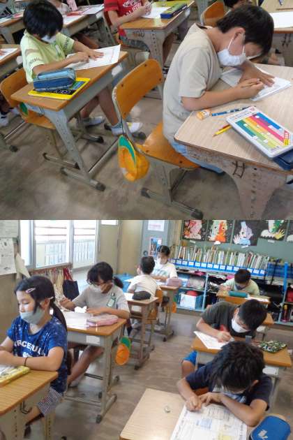社会見学を思い出して新聞づくりを行っている2組の様子です。