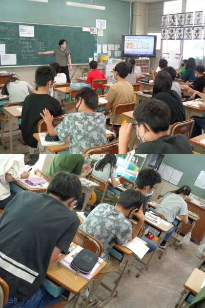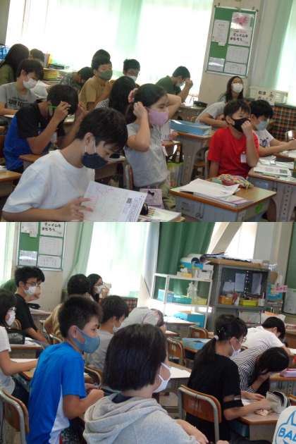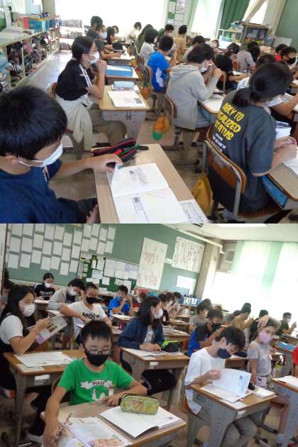 算数は比例の学習です。「画用紙の厚さ10枚ずつはかった時の表」から300枚の厚さを求めます。写真は2組です。