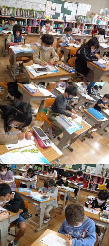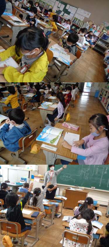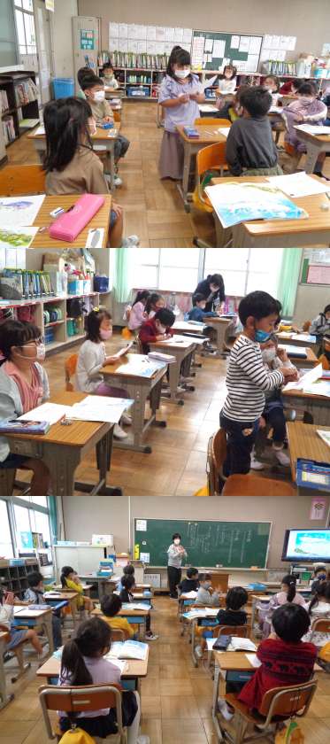 10月19日(火)1年生(1) 公開日 2021/10/19 更新日 2021/10/19 1年 2組のこくごの授業です。 『くじらぐも』の学習が続いています。今日は場面四と五でした。くじらぐもにのって,どんなことを話したかたくさんの想像力で考えました。