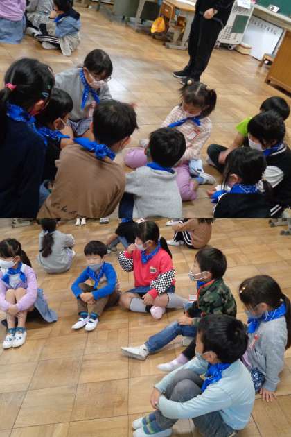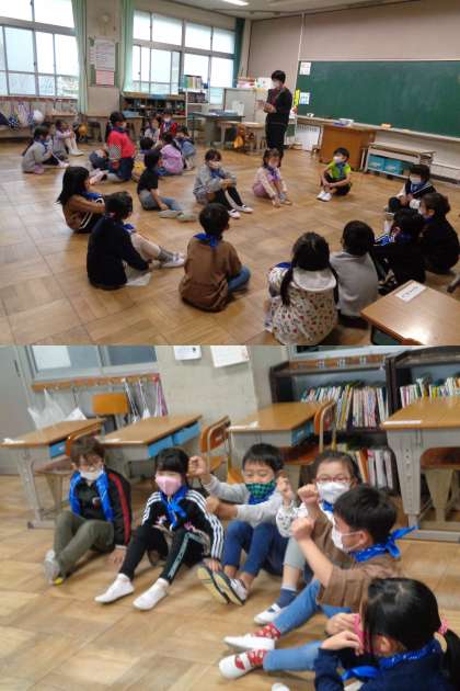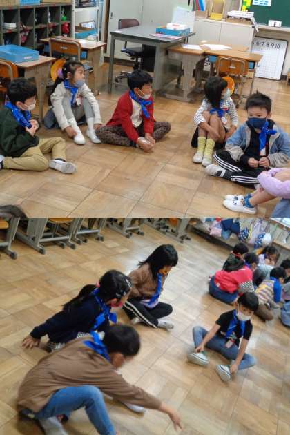 今日の体育は雨のため教室で行いました。 体育参観の玉入れ競技のリハーサルです。写真は2組です。