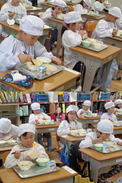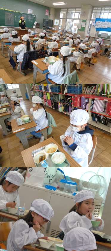 10月26日(火)1年生(1) 公開日 2021/10/26 更新日 2021/10/26 1年 給食中の様子です。 黙食は引き続き続いています。でもみんなでおいしくいただいています。 写真は3組です。