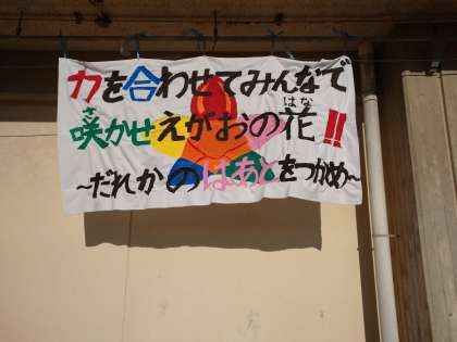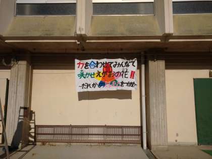 明日の体育参観で,本部後方,体育館の壁面に旗を掲げています。