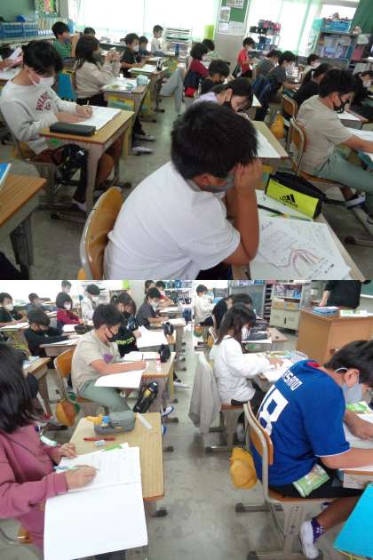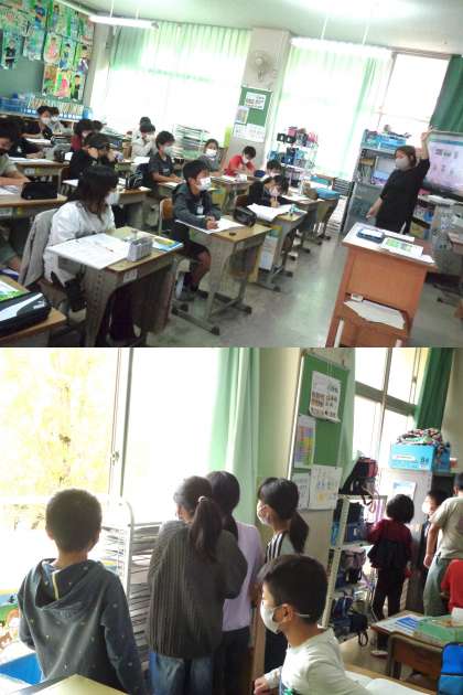 11月2日(火)4年生 公開日 2021/11/02 更新日 2021/11/02 4年 ひょうたんの成長,そして,学校の中の生き物や植物の秋の様子について観察した結果をノートにまとめている1組の子どもたちです。 ちょうど教室の窓からは中庭のイチョウの木が見えるので,少し黄色くなり始めた様子を確認しました。