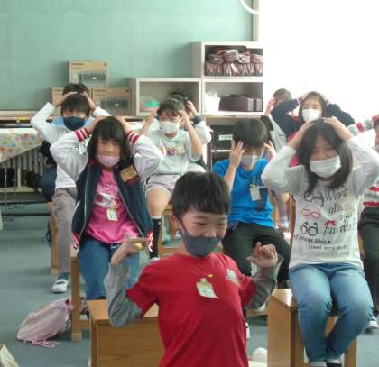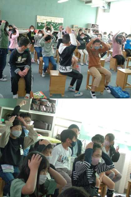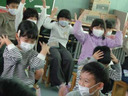 音楽の時間です。 ♪ヘッド,ショルダー,ニー&トゥ♪のリズムに合わせ楽しんでいる2組の子どもたちです。