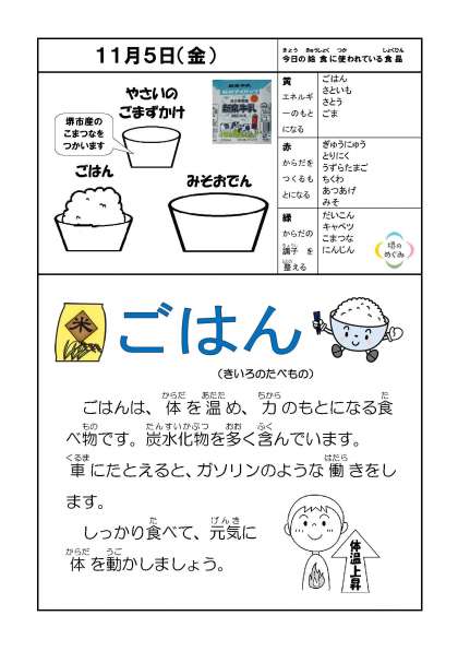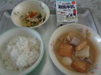 今日のメニューは ・ごはん ・牛乳 ・みそおでん ・野菜のごま酢かけ です。