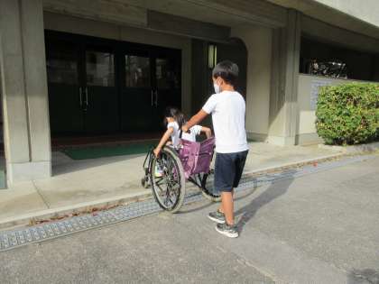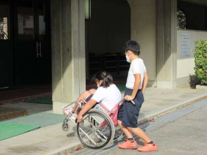 11月8日(月)4年生 公開日 2021/11/08 更新日 2021/11/08 4年 先週に引き続き,車椅子体験をしました。一人だと,段差を超えるのが難しそうでした。友だちに助けてもらって進むことができました。