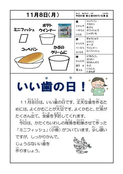 11月8日(月)今日の給食 公開日 2021/11/08 更新日 2021/11/08 給食・食教育 今日のメニューは ・コッペパン ・牛乳 ・かぶのクリーム煮 ・ポテトウインナー ・ミニフィッシュ です。