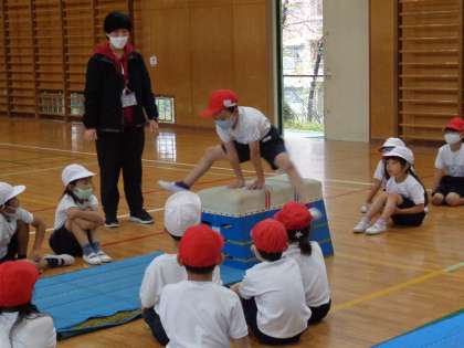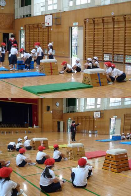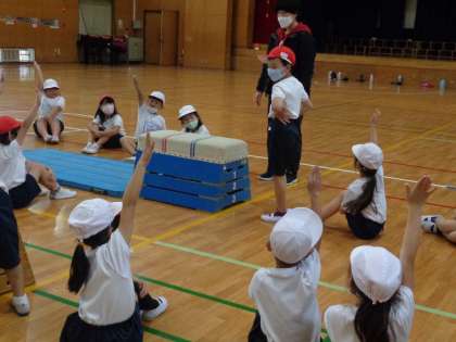 11月9日(火)1年生(3) 公開日 2021/11/09 更新日 2021/11/09 1年 2組の体育,跳び箱です。 今日はふみきり板を使わずに跳びます。 まずはお手本となるお友だちの手の置き方などを確認しました。