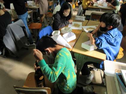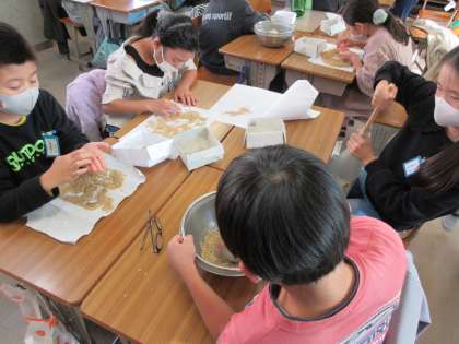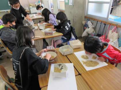 収穫したお米を籾摺りしました。笊や擂り鉢,一升瓶を使って,昔の人がしていたことを体験することができました。