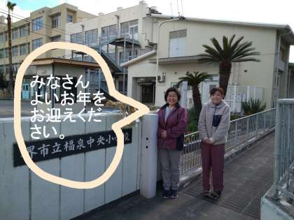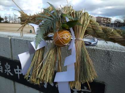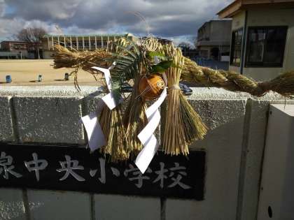 来年もみなさんにたくさんの幸せがくるようにと願いを込めて,今日,5年生の担任の先生が学校の正門に飾りました。