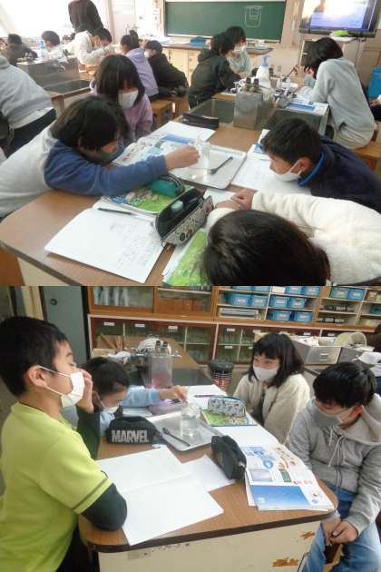 2組の理科の授業です。 「ものの溶け方」を学習しています。 ものが溶けるときのきまりを見つけていきます。
