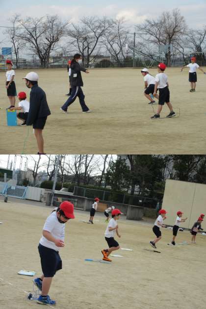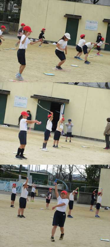 肌寒いですが,時折日差しがある天気です。 なわとびに取り組む前の準備運動を行う1組の子どもたちです。