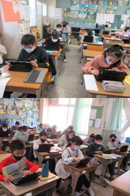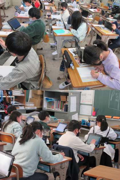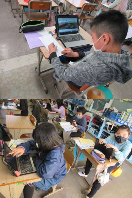 「リーフレットを作ろう」と題して,大阪府の伝統工芸品について調べている3組の子どもたちです。画面を見ているときの集中力はすごいですね。
