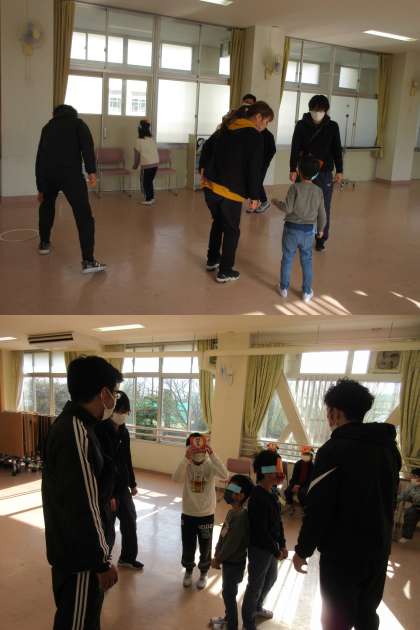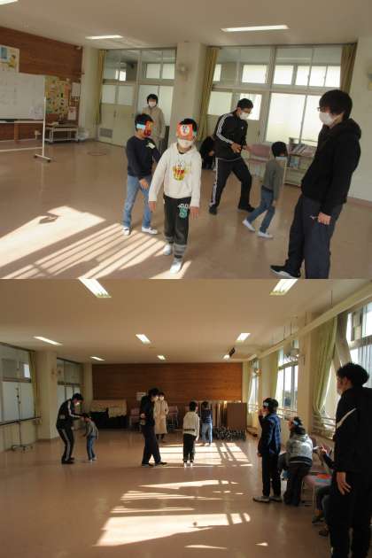 2月2日(水)いずみ学級 公開日 2022/02/02 更新日 2022/02/02 いずみ学級 2時間目朝の会の後は,「チームを信じてゴールをめざせ」を行っていました。 アイマスクをしながら自分のチームの言葉をよく聞いてゴールの位置をめざします。