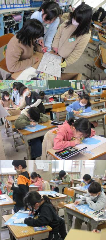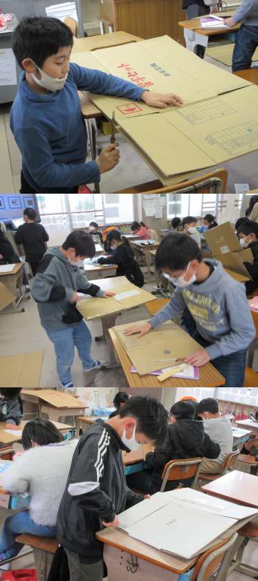 版画の後は,スポンジのボールを打ち合うゲームで使用するテニピン(手の平にはめて使うダンボールのラケット)作りです。