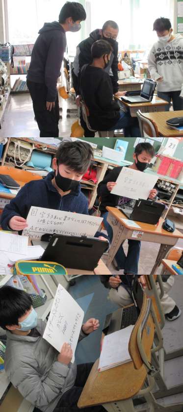 「今,私は,ぼくは〜今の思いをみんなに届けよう〜」では,構成を考えてスピーチメモを作り,自分の今考えていること,そのきっかけ,伝えたい思いなどをクラスの仲間に発表します。(写真は2組の様子です)