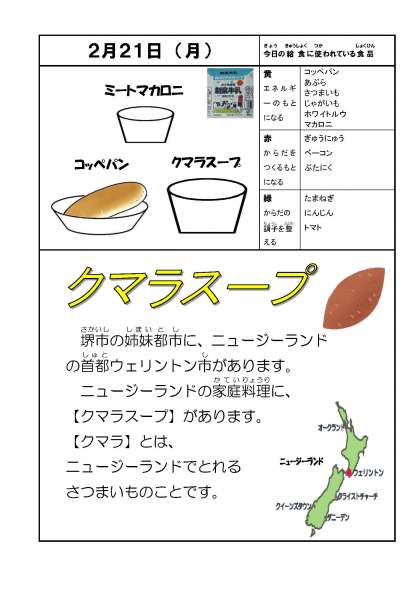 今日のメニューは, ・コッペパン ・牛乳 ・クマラスープ ・ミートマカロニ です。