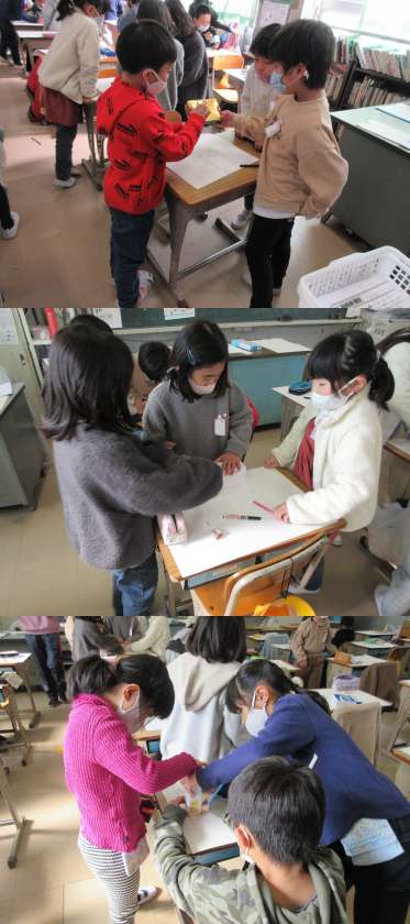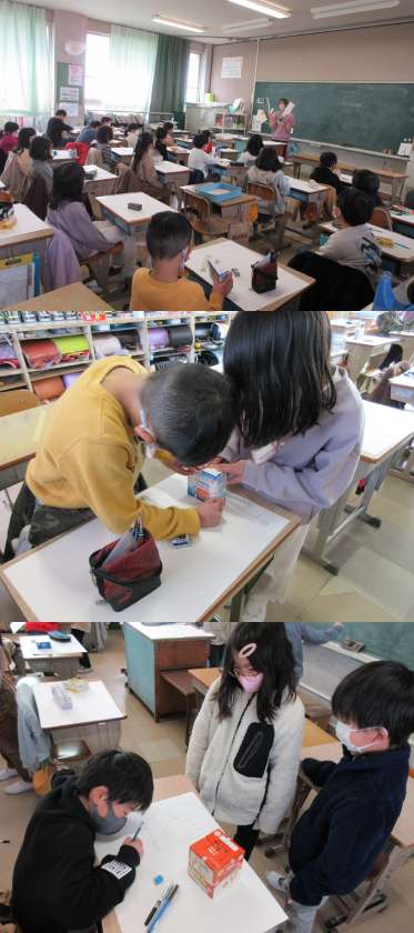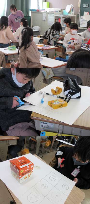 2月22日(火)2年生 公開日 2022/02/22 更新日 2022/02/22 2年 2組の算数です。 6つの面で箱ができることを確認しています。今日は家から持ってきた箱の面の型取りを行いました。画用紙に上手に写しました。面や辺、頂点などを学びます。