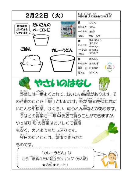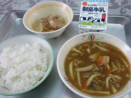 今日のメニューは, ・ごはん ・牛乳 ・カレーうどん ・大根のベーコン煮 です。