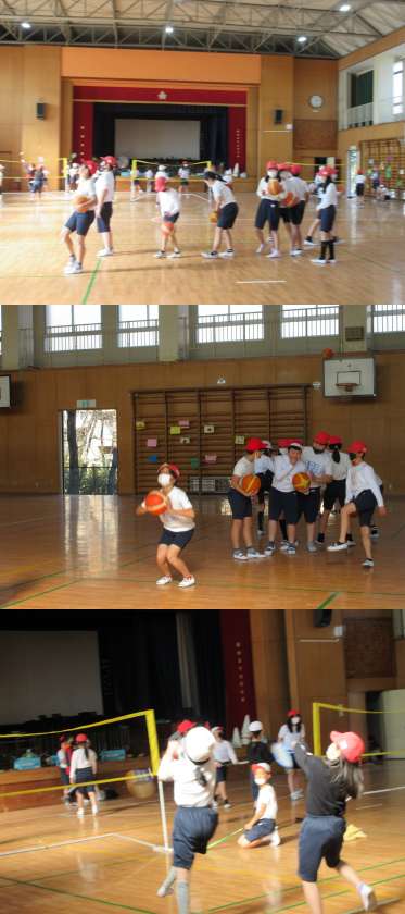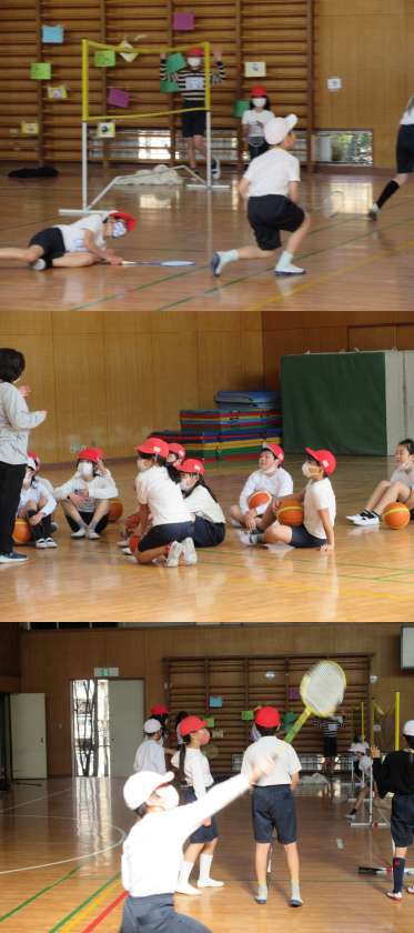 体育の授業でバスケットボールのシュート練習とバドミントンの試合形式に取り組んでいる1組の子どもたちです。