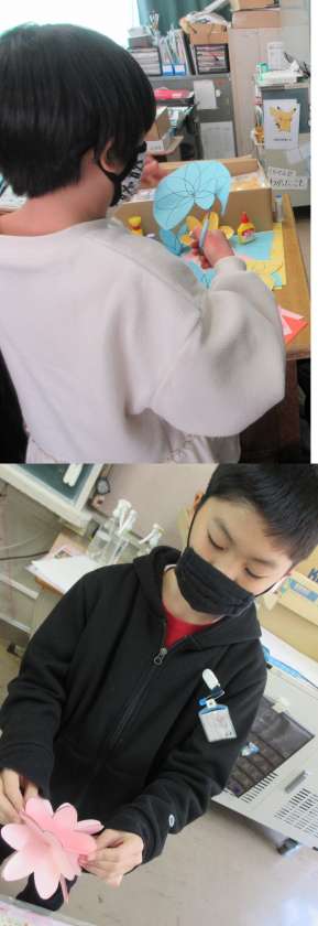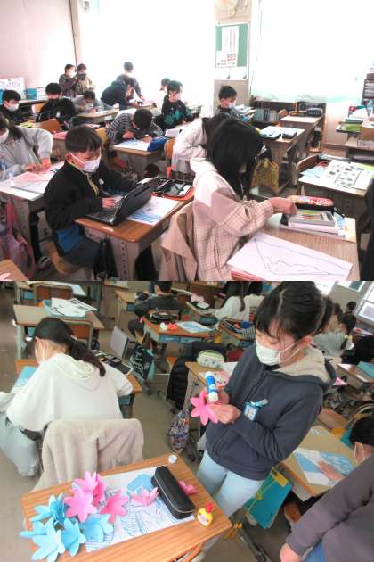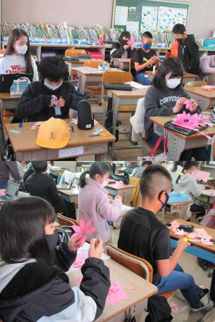 6年生の卒業に向けて,各学年で体育館の装飾を頑張っています。 写真は1組です。
