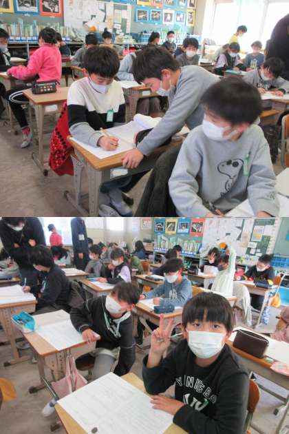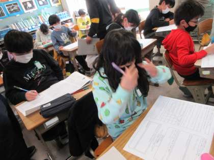 3月8日(火)4年生(2) 公開日 2022/03/08 更新日 2022/03/08 4年 キャリアパスポート「4年生の1年間をふりかえりましょう」を記入している3組の子どもたちです。この1年間でできるようになったことやこんな5年生になりたい,と思うことを書きました。