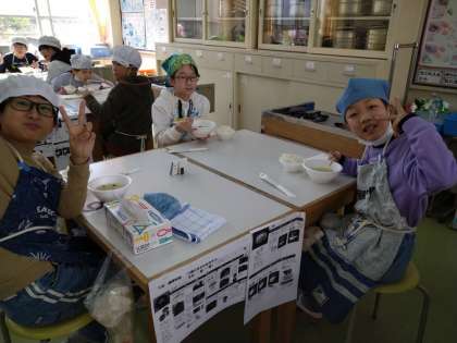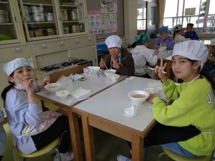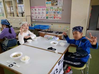 3月10日(木)5年生(1) 公開日 2022/03/11 更新日 2022/03/11 5年 大人数にならないようにクラスの人数を1・2時間目と5・6・時間目に分けて実習をしました。1グループ2〜3人で距離をとりながらお米を研いだり,出汁を取ったり,具材も自分たちで切りました。協力してできたみそ汁とご飯はとてもおいしかったです。
