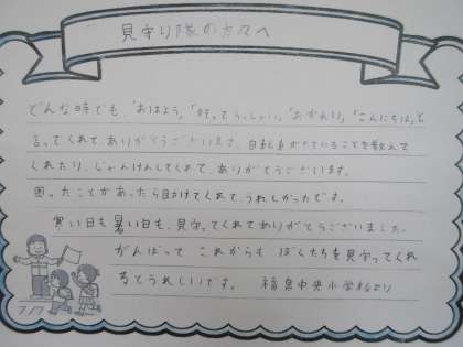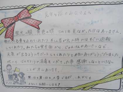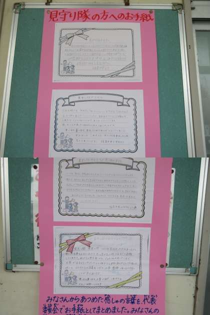 3月11日(金)見守り隊の皆様へ 公開日 2022/03/11 更新日 2022/03/11 学校紹介 今年度も「見守り隊感謝の会」を開催することができませんでした。 しかし,子どもたちは毎日の見守りに対する感謝の思いを手紙にしました。 校内掲示のあと,自治会の方を通じてお渡ししたいと思います。