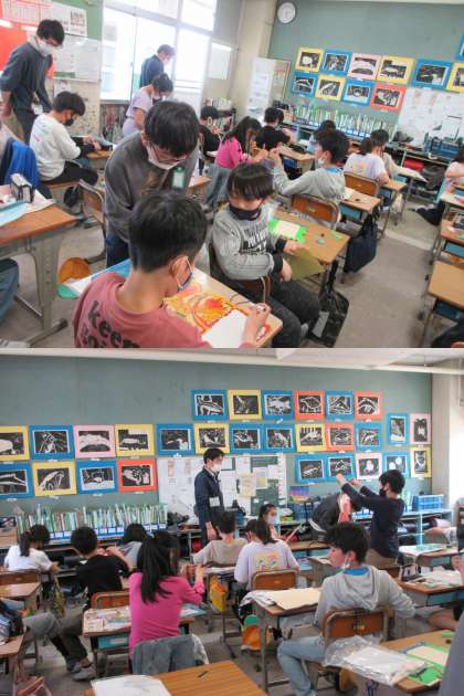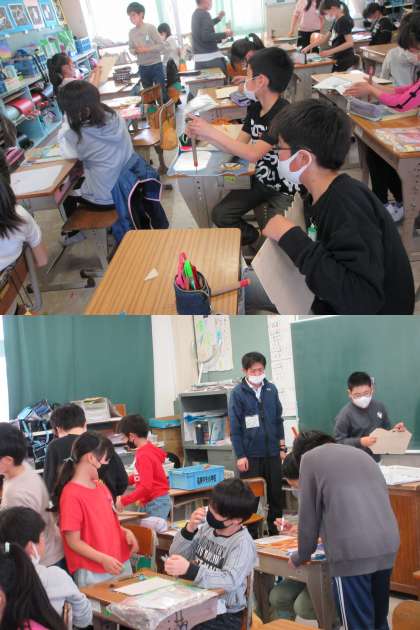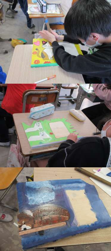 ベニヤ板、角材、くぎなどを使ってオリジナルのホワイトボードを作っている3組の子どもたちです。