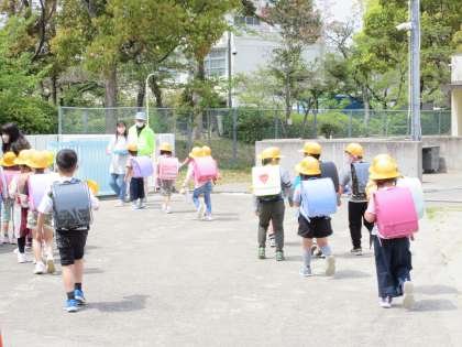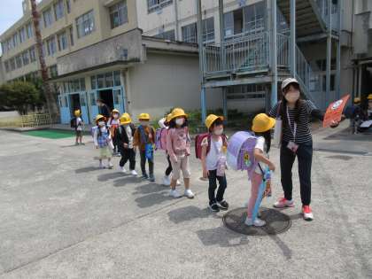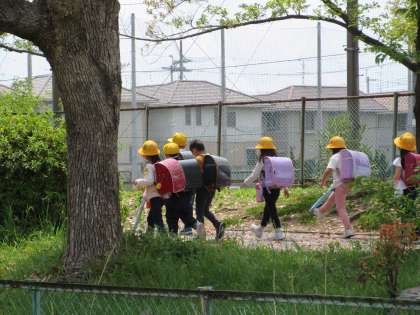 下校の様子です。 しっかり並んで緑道を歩いて帰ります。