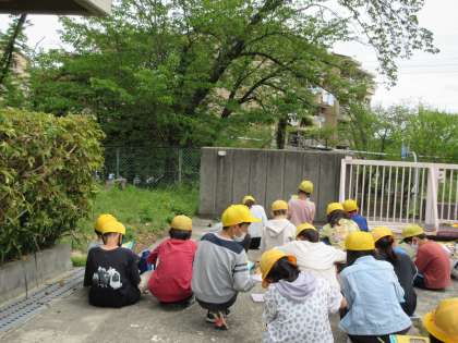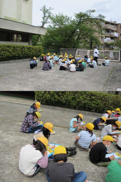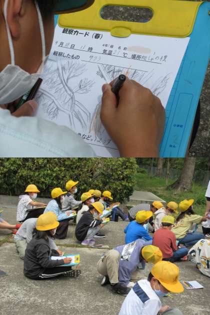 体育館の横の桜の木を見て,「観察カード(春)」にその様子を描いている1組の子どもたちです。