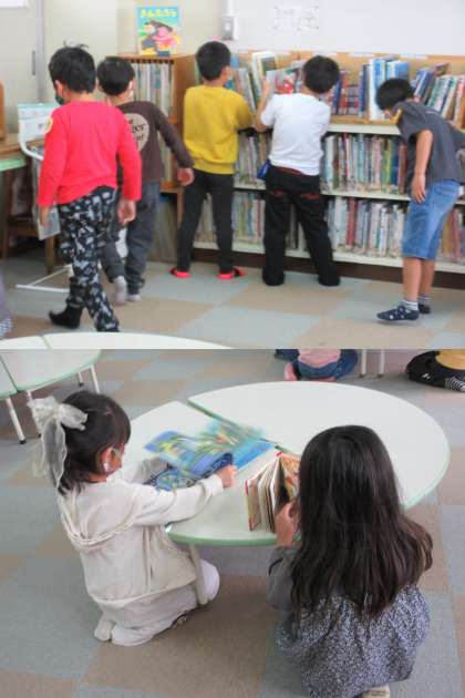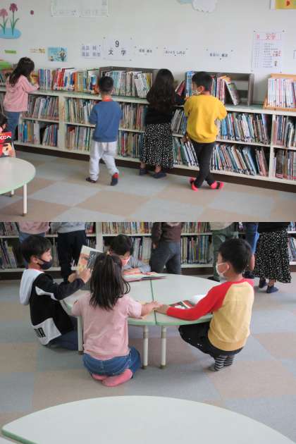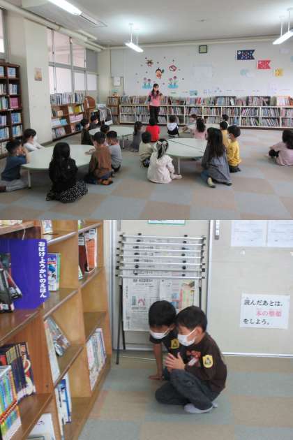 担任の先生から図書室の使い方、本の選び方などを教えてもらっている2組の子どもたちです。
