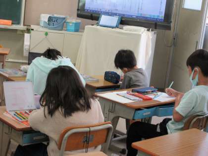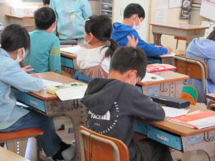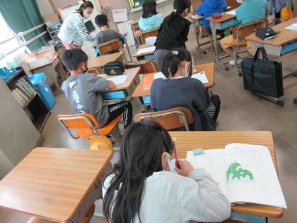 1組は国語の時間です。 『きつつきの商売』の3の場面を作るならどのような物語にするか想像しました。