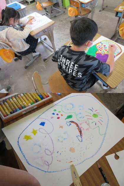 クレパスの上に絵の具をのせる(まぜる)とどんな効果があるかを担任の先生から聞きました。早速チャレンジしている3組の子どもたちです。
