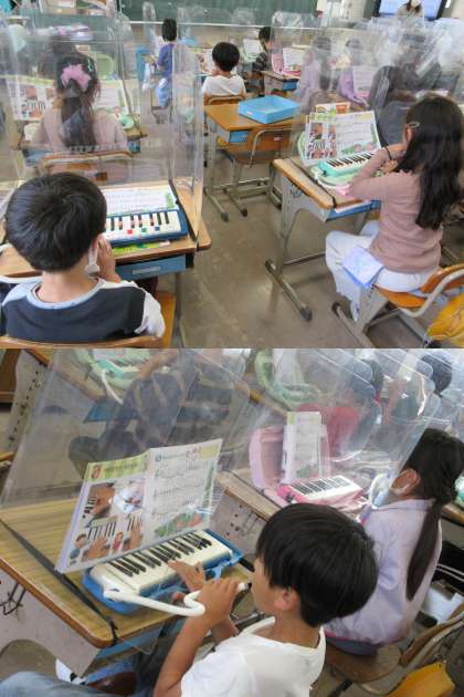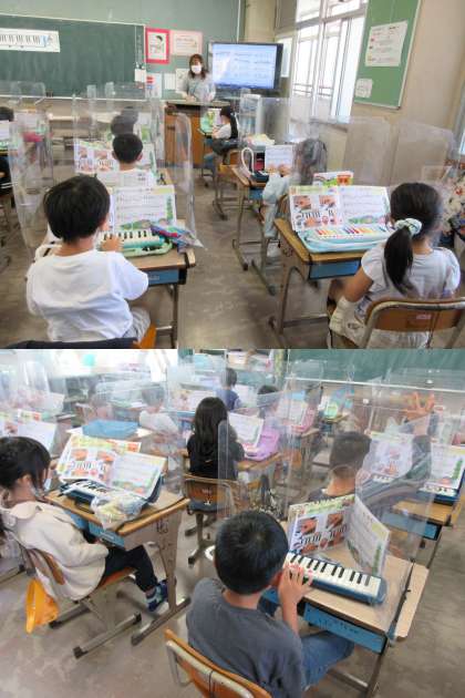 鍵盤ハーモニカの練習をしている2組の子どもたちです。