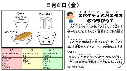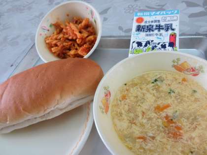 今日の給食は ・コッペパン ・牛乳 ・コーンスープ ・ミートマカロニ です。