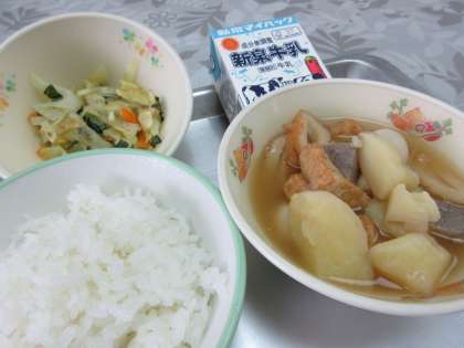 今日の給食は ・ごはん ・牛乳 ・関東煮 ・おひたし です。