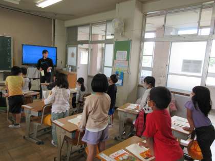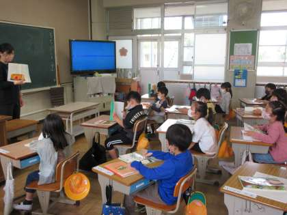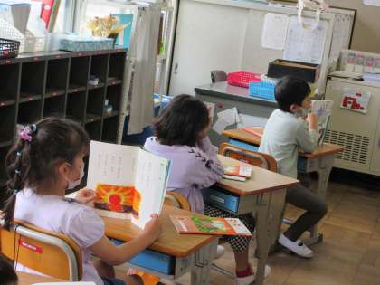『あさの おひさま』を元気な声で読む1組の子どもたちです。