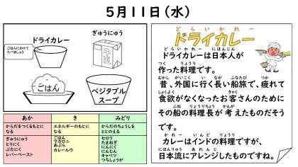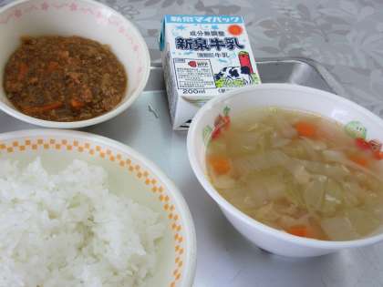 今日の給食は ・ごはん ・牛乳 ・ベジタブルスープ ・ドライカレー です。