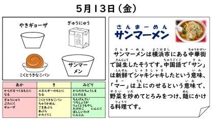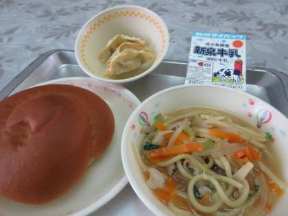 今日の給食は ・黒糖きなこパン ・牛乳 ・サンマーメン ・焼きギョーザ です。