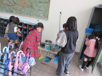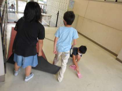 そうじの時間,子どもたちの様子です。一週間分の汚れをしっかり取りましょう。