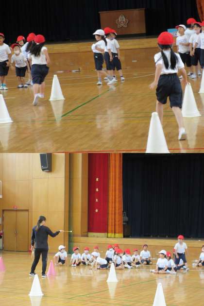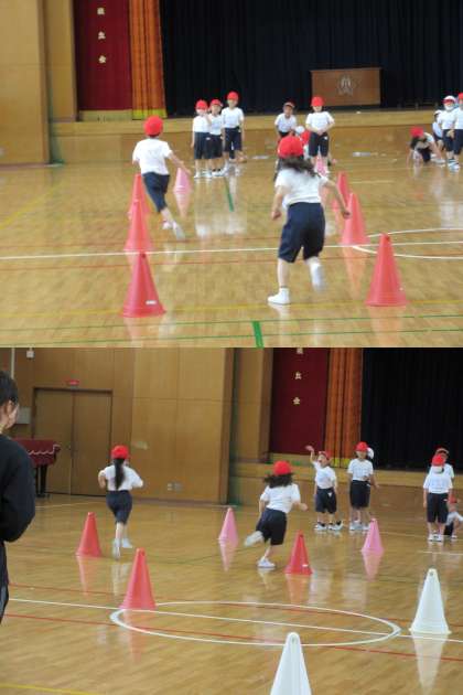 コーンの間をスムーズに走り抜けるにはどうしたらいいか,先生やお友達のお手本を見ながら学習していました。