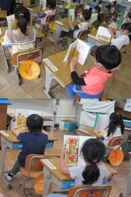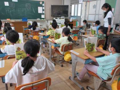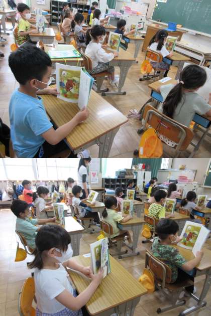 国語の授業です。よい姿勢で『はなの みち』を読む2組の子どもたちです。