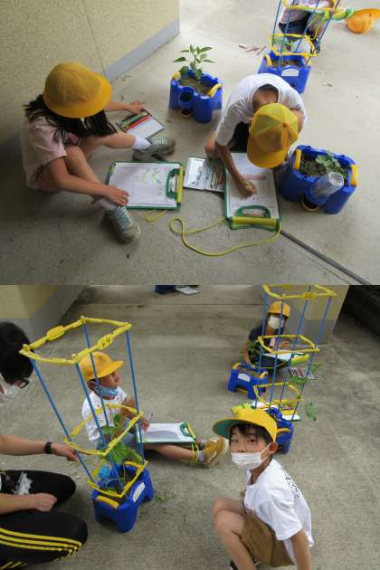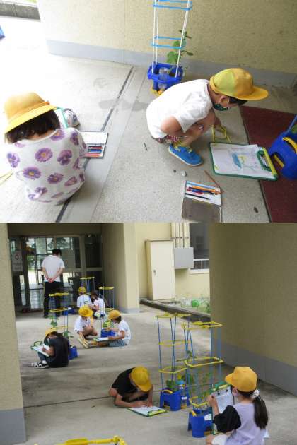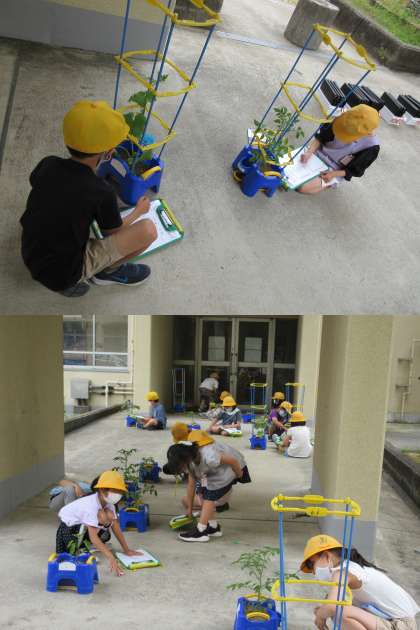 トマトやピーマン,おくらなどの観察を行っている2年生です。 写真は3組の子どもたちです。