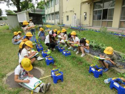 1組の子どもたちも「見つけたよカード」に記入していました。 発見したものを絵と文字で表現しています。