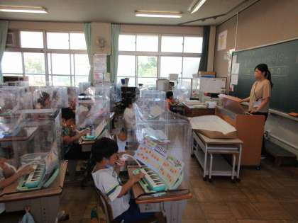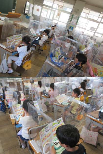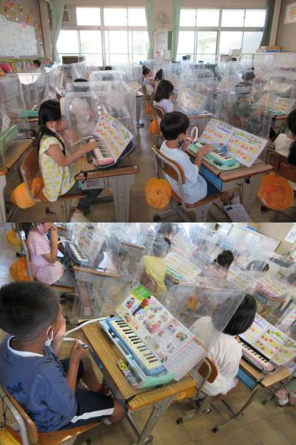 鍵盤ハーモニカの人さし指の使い方を練習している1組の子どもたちです。