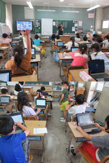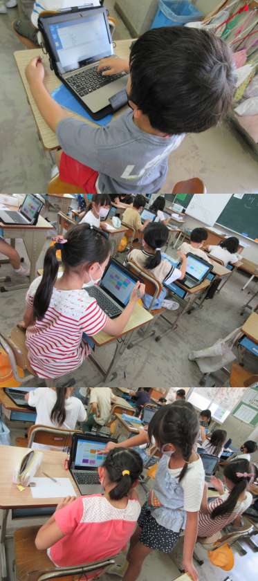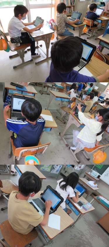 6月3日(金)2年生 公開日 2022/06/03 更新日 2022/06/03 2年 大庭寺方面への校区たんけんから帰ってきた2年生です。 タブレットの学習ノートにメモを残しています。 写真は1組の子どもたちです。